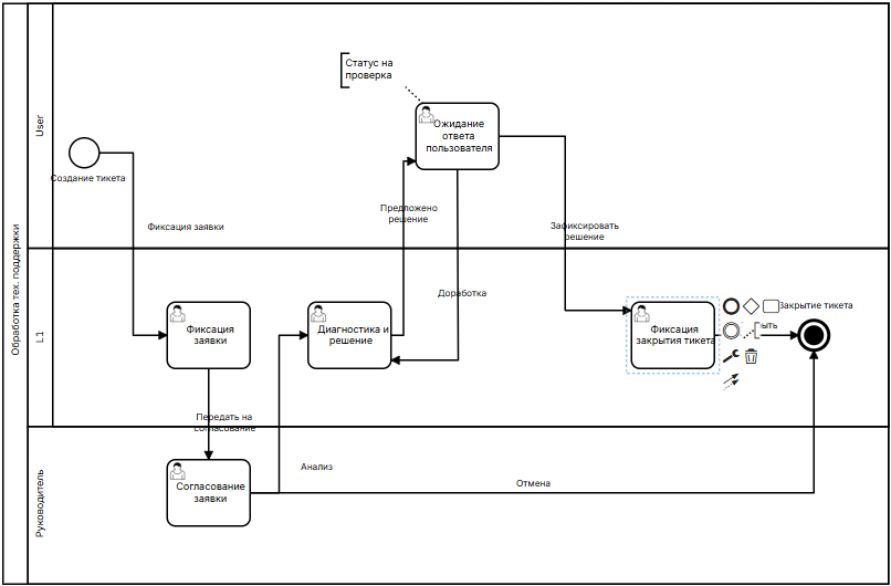 Если заявка утверждена, специалист L1 приступает к диагностике и формированию решения. После выполнения работ он направляет результат пользователю. Тикет переходит в статус «Ожидание ответа пользователя».
