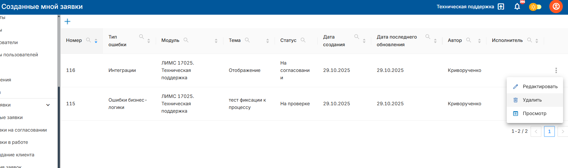 1. Созданные мной — все обращения, инициированные текущим пользователем. Здесь можно отслеживать статус, комментарии и решения по собственным заявкам.