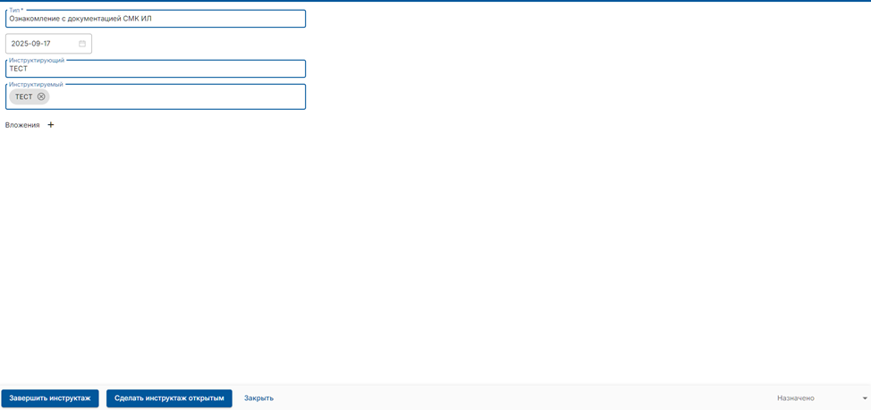 Пользователь заполняет поле «Тип», выбирает дату, выбирает инструктирующего и инструктируемого из списка, после чего нажимает «Завершить инструктаж» или «Сделать инструктаж открытым».