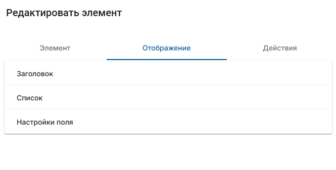 Редактор элемента формы содержит три вкладки: «Элемент», «Отображение», «Действия».