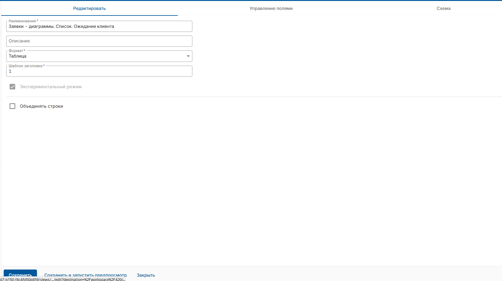 Флажок «Экспериментальный режим» включает расширенные или нестабильные функции представления, используемые при тестировании новых возможностей. Применение данного режима рекомендуется ограничивать тестовыми стендами. Опция «Объединять строки» управляет логикой агрегации строк в результирующей выборке. При её включении система может выполнять группировку записей по совпадающим ключам и формировать объединённые строки вместо полного детализированного списка. В нижней части окна доступны операции сохранения: «Сохранить» для фиксации изменений без запуска, «Сохранить и запустить предпросмотр» для проверки результата выборки и «Закрыть» для выхода без сохранения.