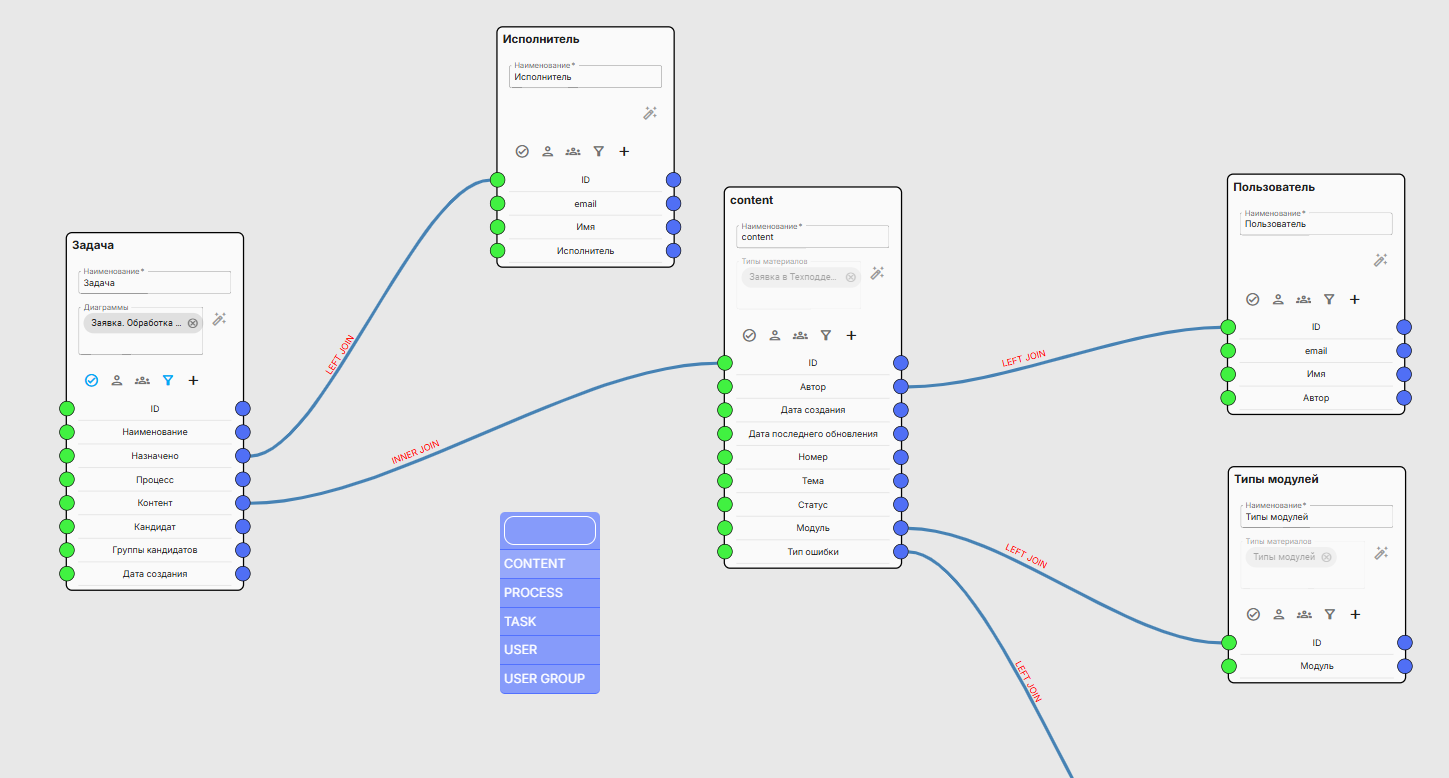 В левой панели схемы доступен перечень типов сущностей, которые могут быть добавлены в представление. Типы включают, в частности, CONTENT, PROCESS, TASK, USER, USER GROUP и другие, доступные в текущей конфигурации. Выбор типа определяет набор доступных полей и семантику сущности: