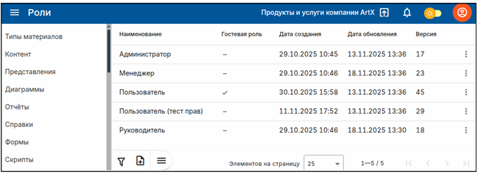 Редактирование осуществляется при нажатии на саму роль, или же при нажатии на кнопку «Редактировать» в выпадающем меню в правой части строки роли. Фильтрация осуществляется при нажатии на кнопку «Фильтр» на нижней панели инструментов. После нажатия открывается дополнительная боковая панель, где указываются параметры фильтрации. Удаление осуществляется при нажатии на кнопку «Удалить» в выпадающем меню в правой части строки роли. Редактирование роли В поле «Наименование» указано наименование роли использованное при её создании. В поле «Главная страница» указывается страница, которая загружается первой при входе пользователя с указанной ролью в соответствующий проект. В процессе редактирования роли происходит указание доступа к параметрам из списка для соответствующего функционала с помощью выставления отметок в чекбоксах параметров. Отметки в чекбоксах параметров бывают двух вариантов: - параметр включён; - параметр отсутствует. В случае указания включения параметра его функционал становится доступен указанной роли. В случае отсутствия включения параметра - функционал недоступен. Список параметров состоит из четырёх вариантов: Создавать, Читать, Редактировать, Удалять. Примечание: Не у каждого функционала есть все возможные параметры. ● Создавать - позволяет выполнять создание контента функционала. ● Читать - позволяет осуществлять просмотр функционала, без возможности влиять на него. ● Редактировать - позволяет вносить изменения в функционале. ● Удалять - позволяет удалять созданный контент функционала. Примечание: При отсутствии параметра «Читать», но наличии других, отображаться функционал не будет. Описание функционала Доступ к функционалу можно разделить на две категории: доступ к веб интерфейсу настроек, доступ к данным модулей. Доступ к интерфейсу настроек Доступ к данным модулей Группы Управление ролями Категории Управление пользователями Типы материалов Управление уведомлениями Контент Управление комментариями Данные представления Управление диаграммами Справка Управление категориями Дизайнер отчётов Управление типами материалов (шаблоны) Бизнес-процессы Управление типами материалов (Поля) Бизнес-процессы Управление представлениями (Шаблоны) Бизнес-процессы Управление представлениями (Поля) Сущности представлений Управление представлениями (Сущности) Формы Управление представлениями (Представления) Поля материалов Управление группами Представления Управление отчётами Поля представлений Управление формами Пользователи проекта Управление группами пользователей Роли проекта Управление справками Группы пользователей Управление файлами Скрипт Управление скриптами (Скрипты) Включения Управление скриптами (Исполнение) Файлы Управление процессами (Процессы) Управление процессами (Задачи) Управление контентом Управление включениями Доступ к интерфейсу настроек Группы Интерфейс настроек «Группы» имеет четыре параметра: Создавать, Читать, Редактировать, Удалять. Доступ к функционалу «Группы» предоставляется через основное боковое меню. Раздел группы существует для вывода форм в меню пользователя. Группа представляет собой объединяющую папку для хранения нескольких форм. Она может быть пустой или содержать форму - в этом случае при нажатии на наименование группы в пользоват